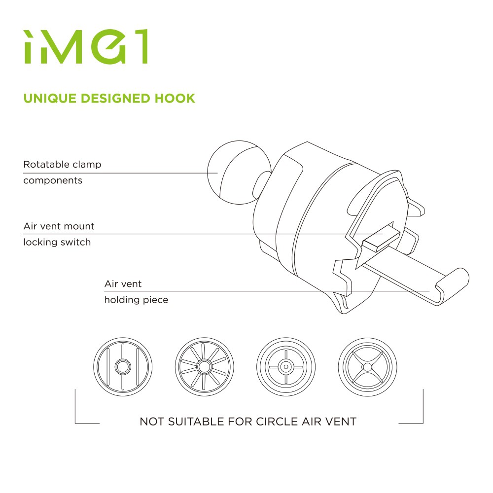IMG1 features powerful neodymium magnets, and unique designed hook to secure the phone holder attaches to the air vents tightly and ensure the phone attach in place.