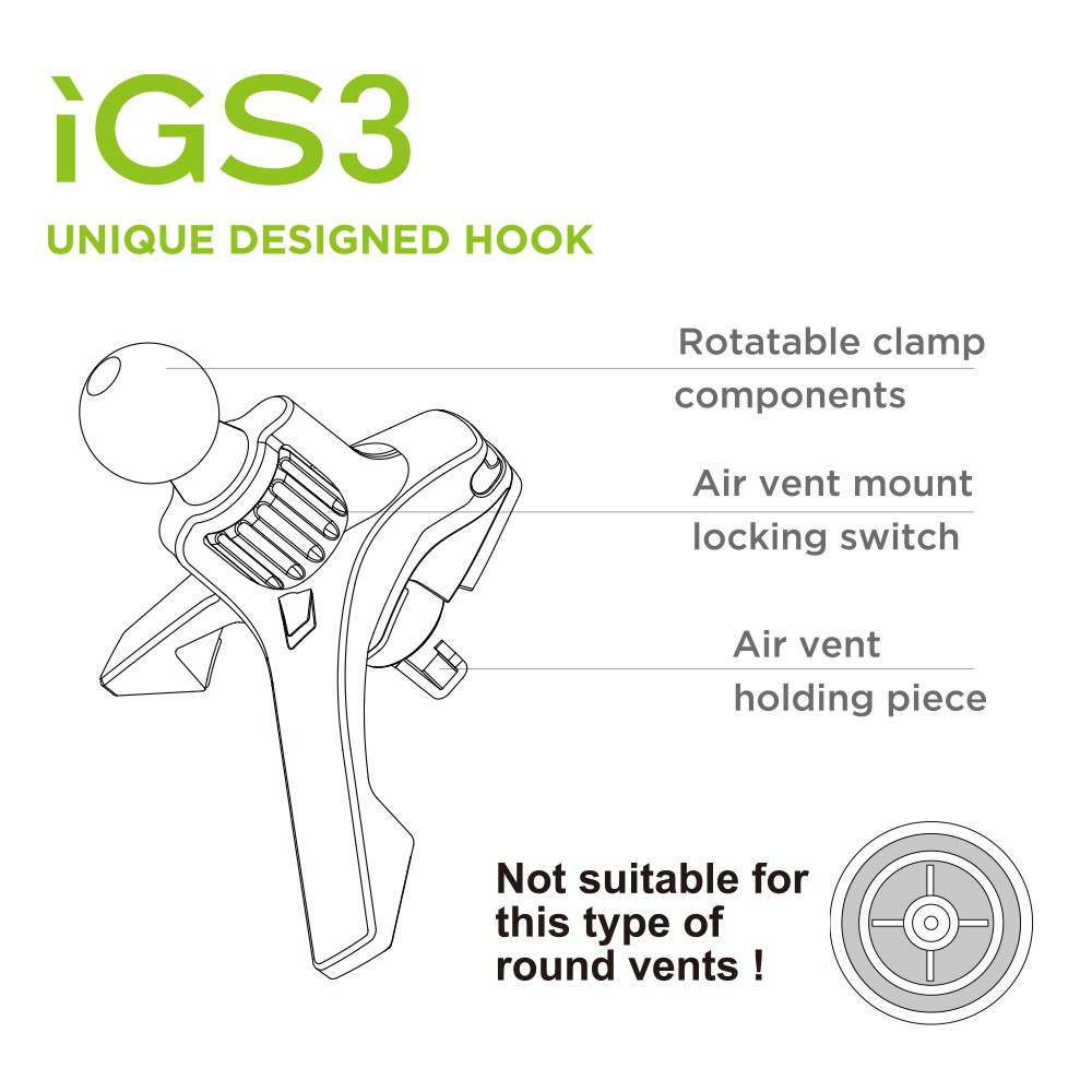 IGS3 features powerful neodymium magnets, and unique designed hook to secure the phone holder attaches to the air vents tightly and ensure the phone attach in place.