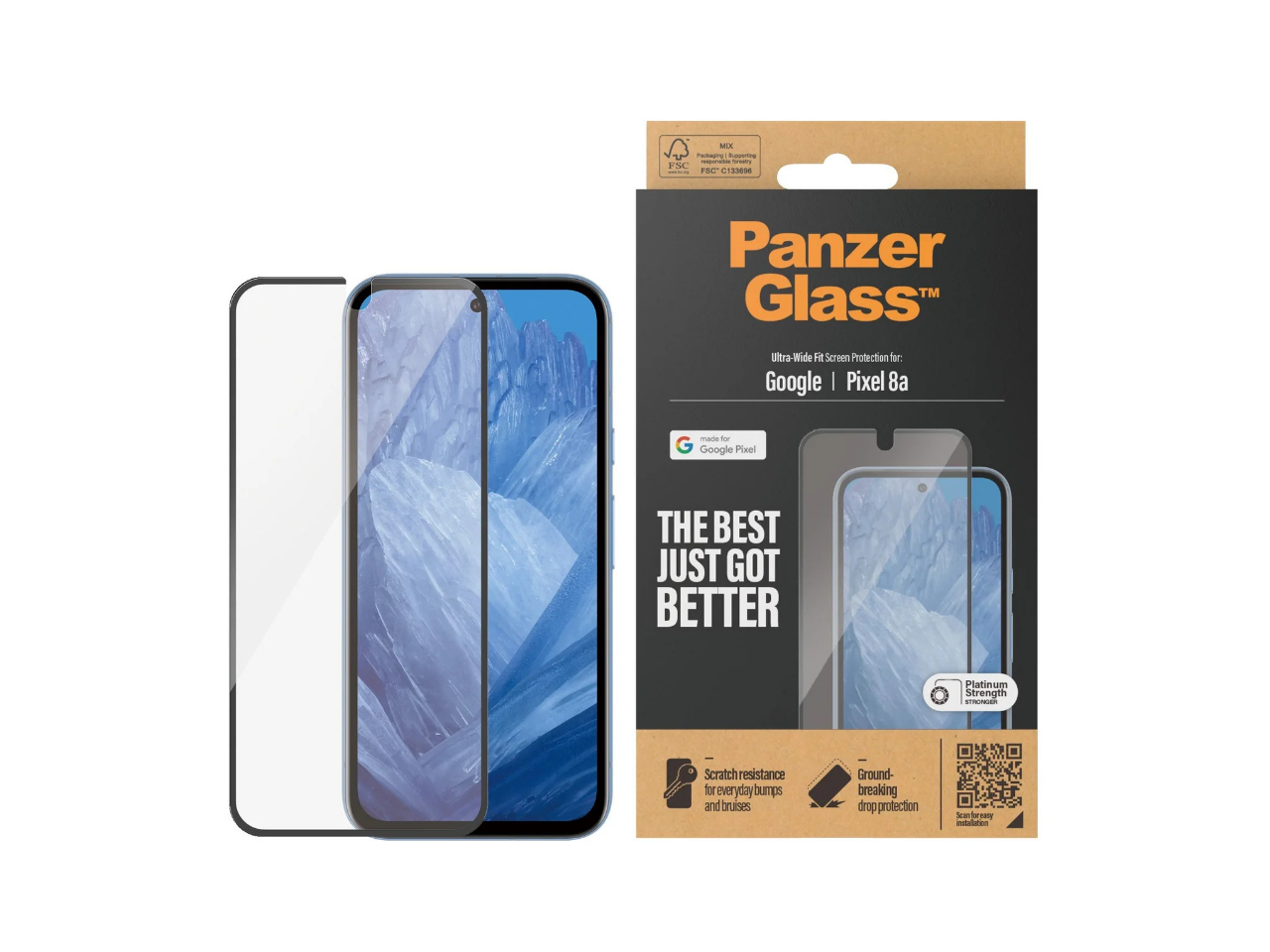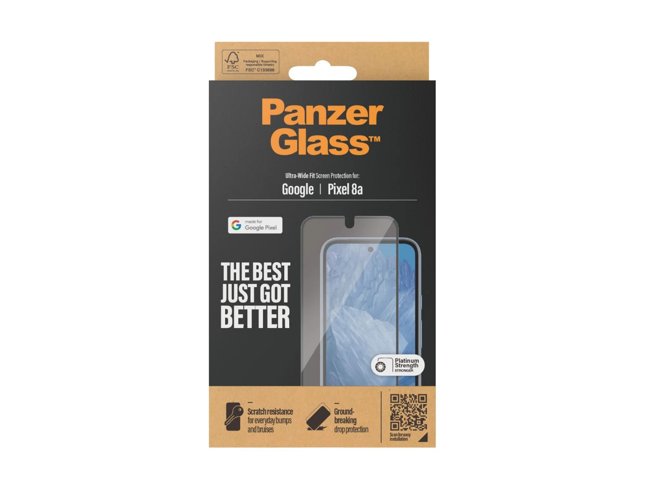 Panzerglass Screen Protector for Google Pixel 8a. Protect your phone from the hazards of everyday life with PanzerGlass™. Accidental bumps against sharp-edged dangers in your pocket or crushing falls onto stone-hard pavements are no match for this scratch and shock-resistant screen protector. It even has a smudge-free coating with the antibacterial effect that reduces traces of fingerprints and kills up to 99.99% of all common surface bacteria. The screen protector is easy to apply and once installed, you’ll never again fear the sight of your phone tumbling to the ground.